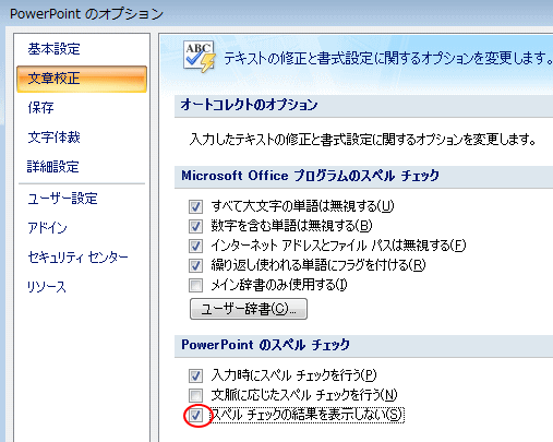 Powerpoint 2010 スペルチェックの結果を表示しないようにするには